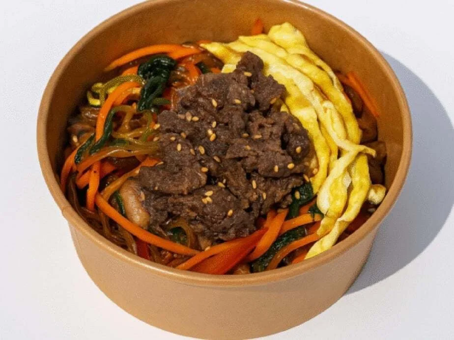 Stir-fried Korean glass noodles with beef bulgogi, carrots, spinach, mushrooms, bell peppers, onions and sesame seeds.